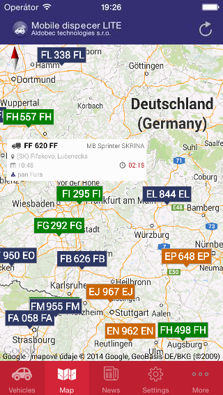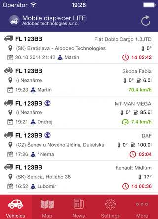 Podobne ako Mobilný Dispečer pre Android, aj iOS aplikácia ponúka aktuálne on-line informácie o vozidlách. Prostredníctvom mobilného telefónu tak presne viete, kde sa Vaše vozidlo nachádza, kto na ňom jazdí, aký je stav paliva v nádrži, prípadne teplota v nákladnom priestore vozidla. Okrem aktuálneho stavu vozidla zobrazuje Mobilný Dispečer aj aktuálnu polohu a trasu vozidla na mape, ako aj prehľadnú Knihu jázd s uskutočnenými jazdami daného vozidla.